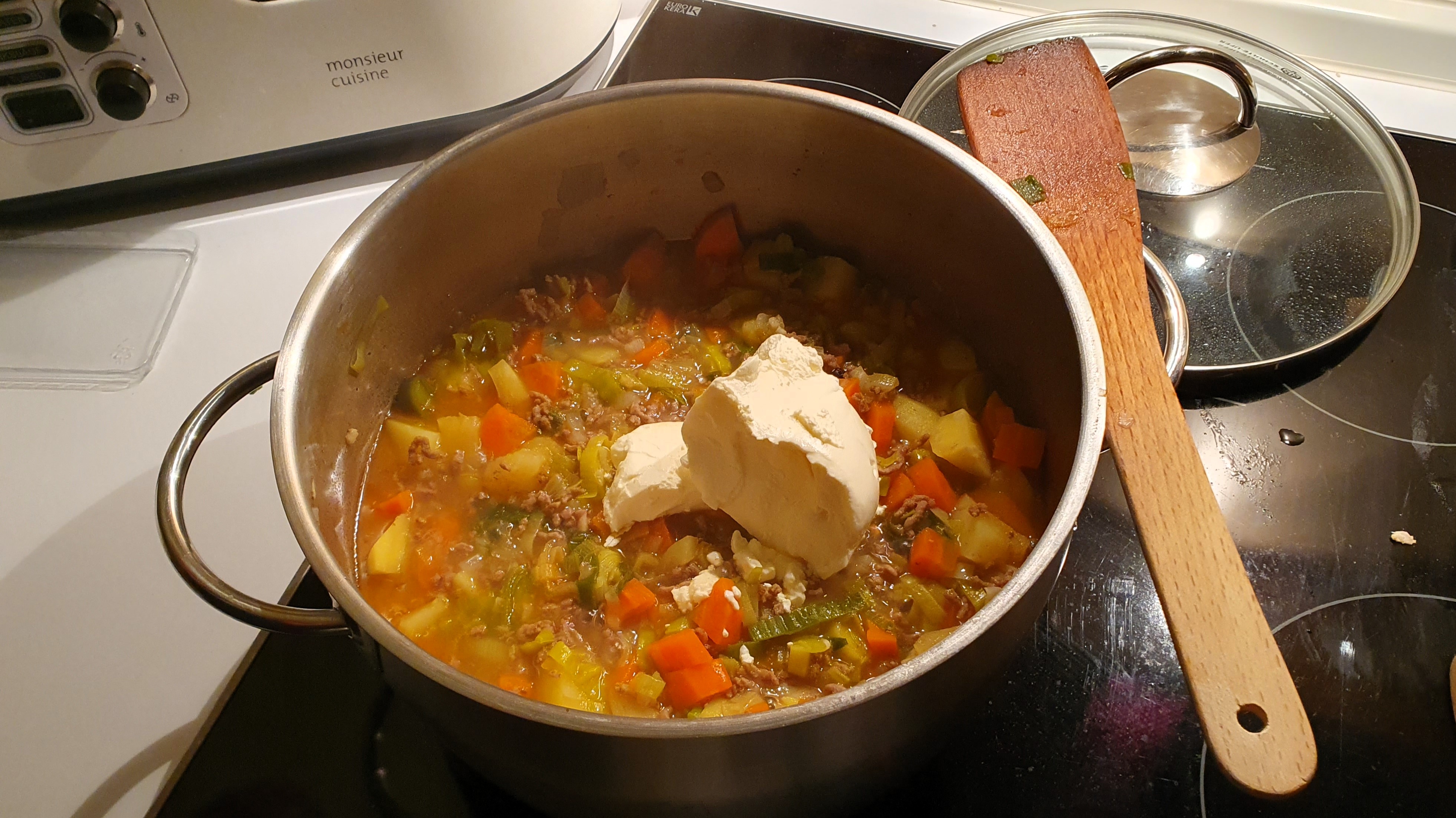 Topfinhalt mit der Gemüsebrühe ablöschen, Gewürznelken, Wachholderbeeren und Lorbeerblatt hinzufügen und dann den Bauerntopf bei mittlerer Hitze ca. 20 Min. köcheln lassen.