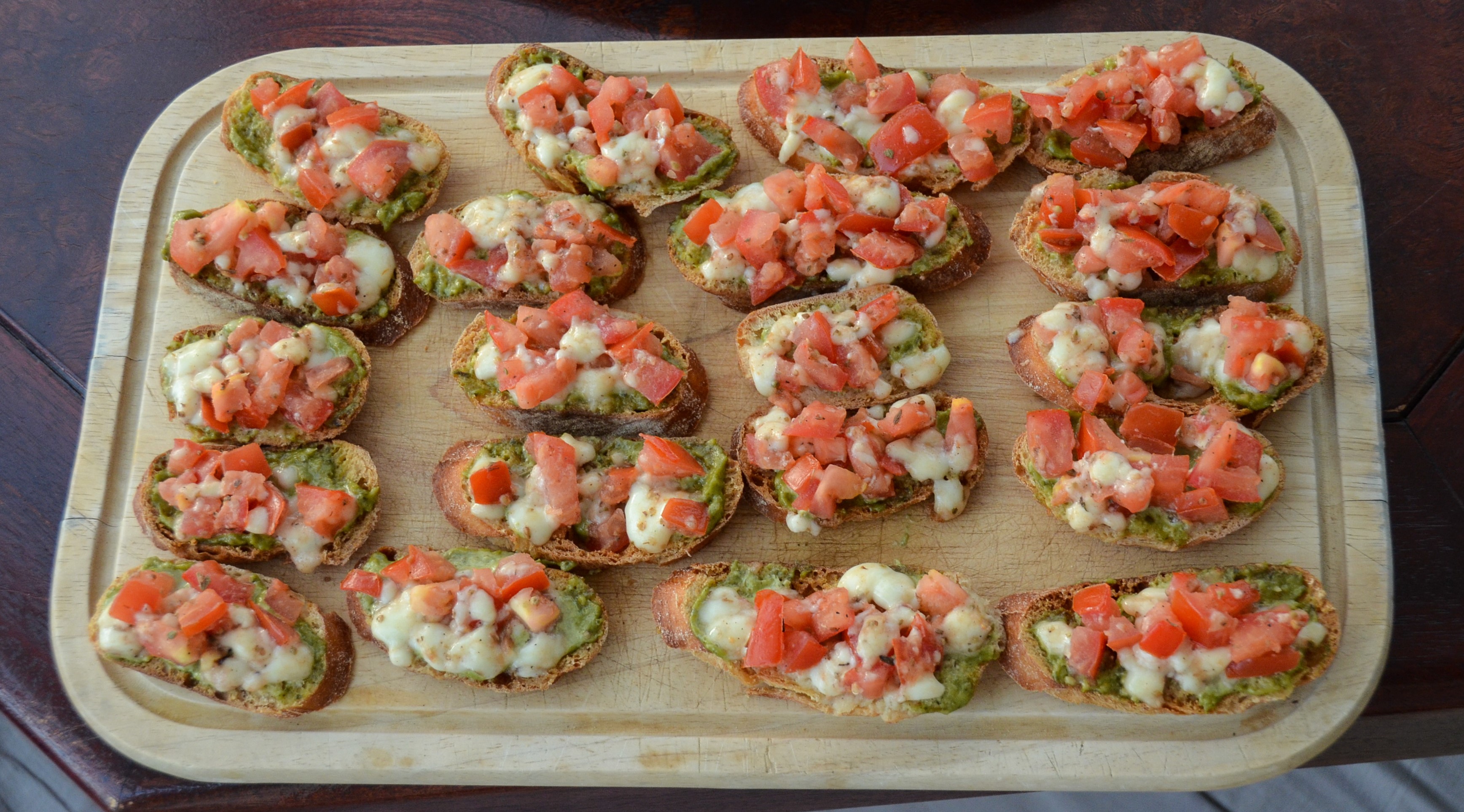 Ciabattabrot in dünne Scheiben schneiden und im Backofen bei 200 °C goldbraun backen. Währenddessen Tomaten von Kernen befreien und würfeln. Mit Zucker, Salz und Pfeffer abschmecken. Olivenöl dazugeben. Mozzarella gerieben dazugeben. Knoblauch abziehen und auf inzwischen knusprige Brotscheiben reiben. Scheiben dann mit Pesto bestreichen und Mozzarella-Tomaten-Mischung darauf verteilen. Dabei möglichst schnell und trocken arbeiten, damit das Brot nicht durchweicht.