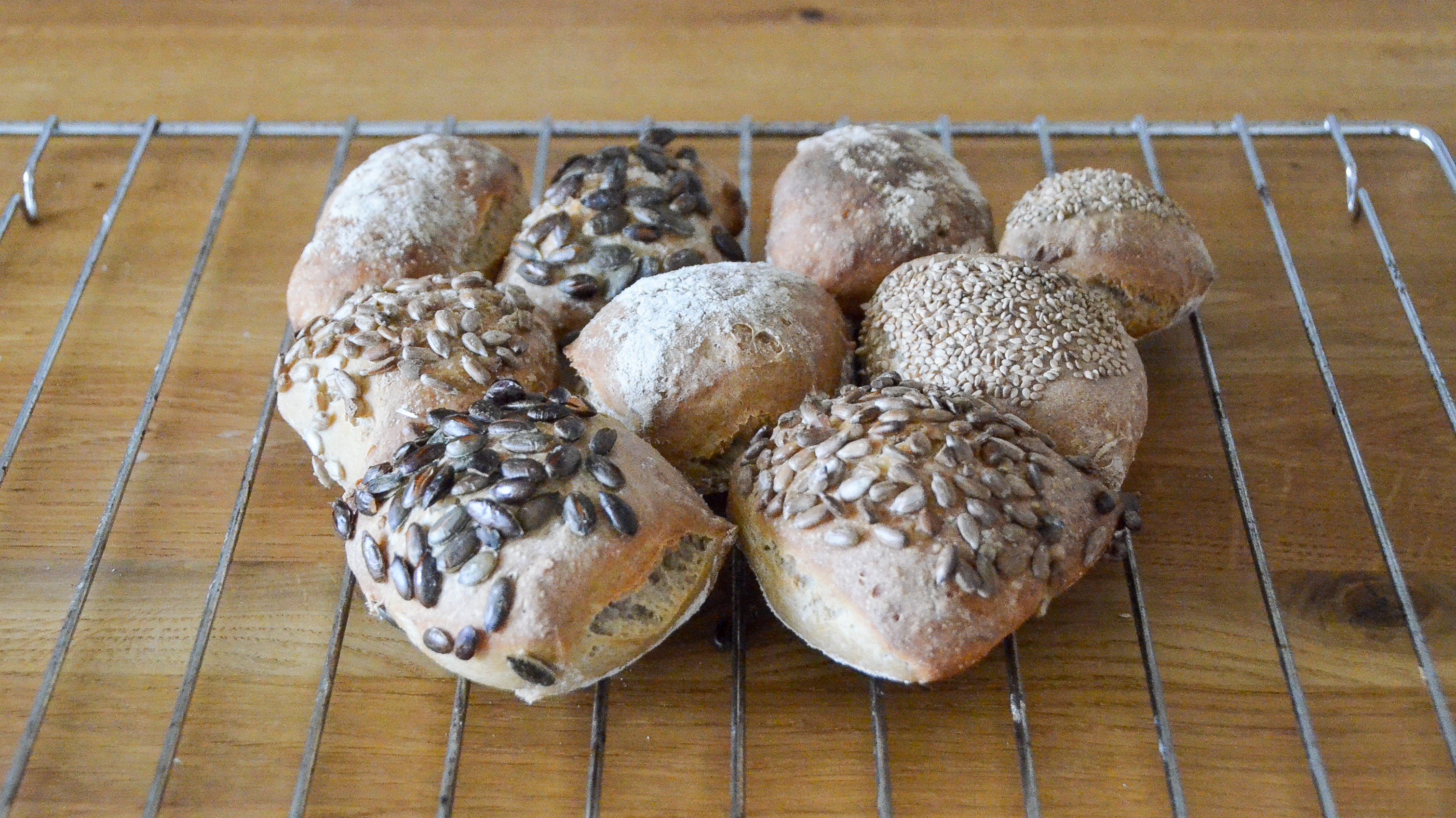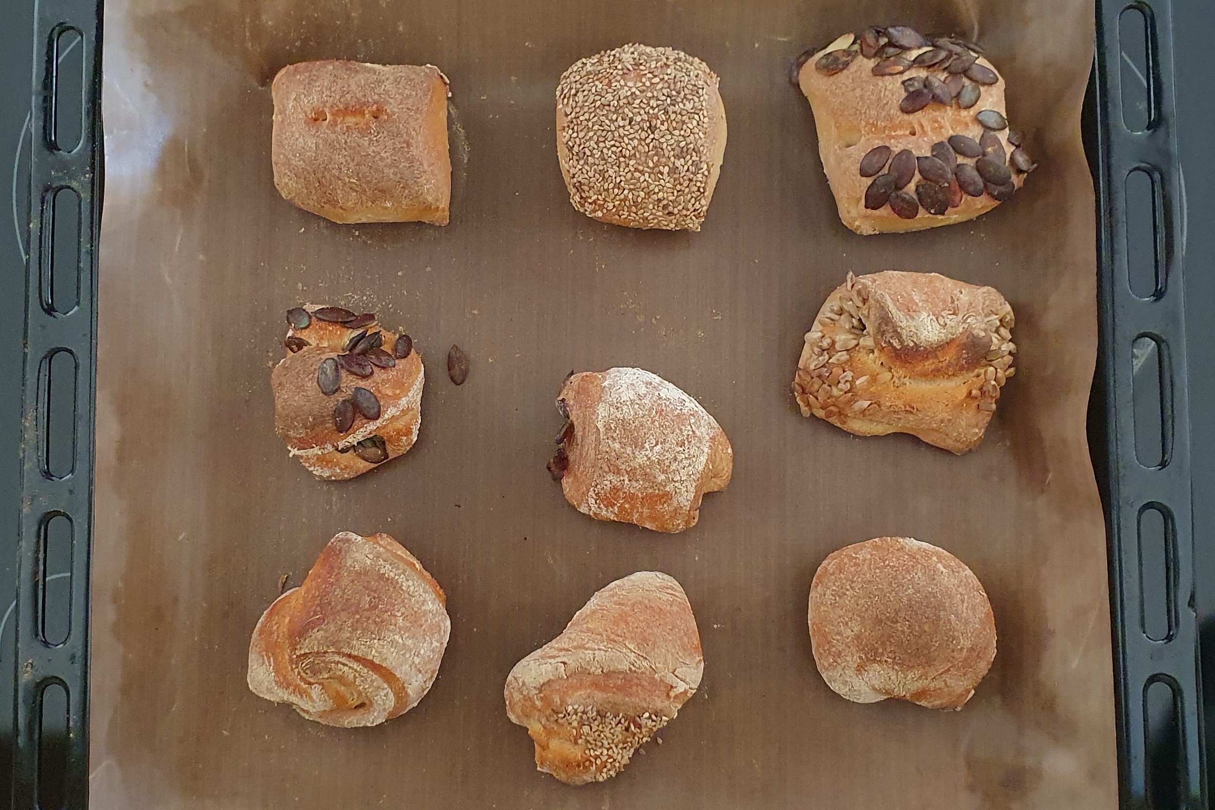 Teig auf einer gemehlten Fläche in 18 gleich große Stücke zerteilen. Oberseite in Kernen wälzen oder mit etwas Mehl bestäuben, dann aufs Backbleck legen. Die Teiglinge müssen nicht hübsch sein.