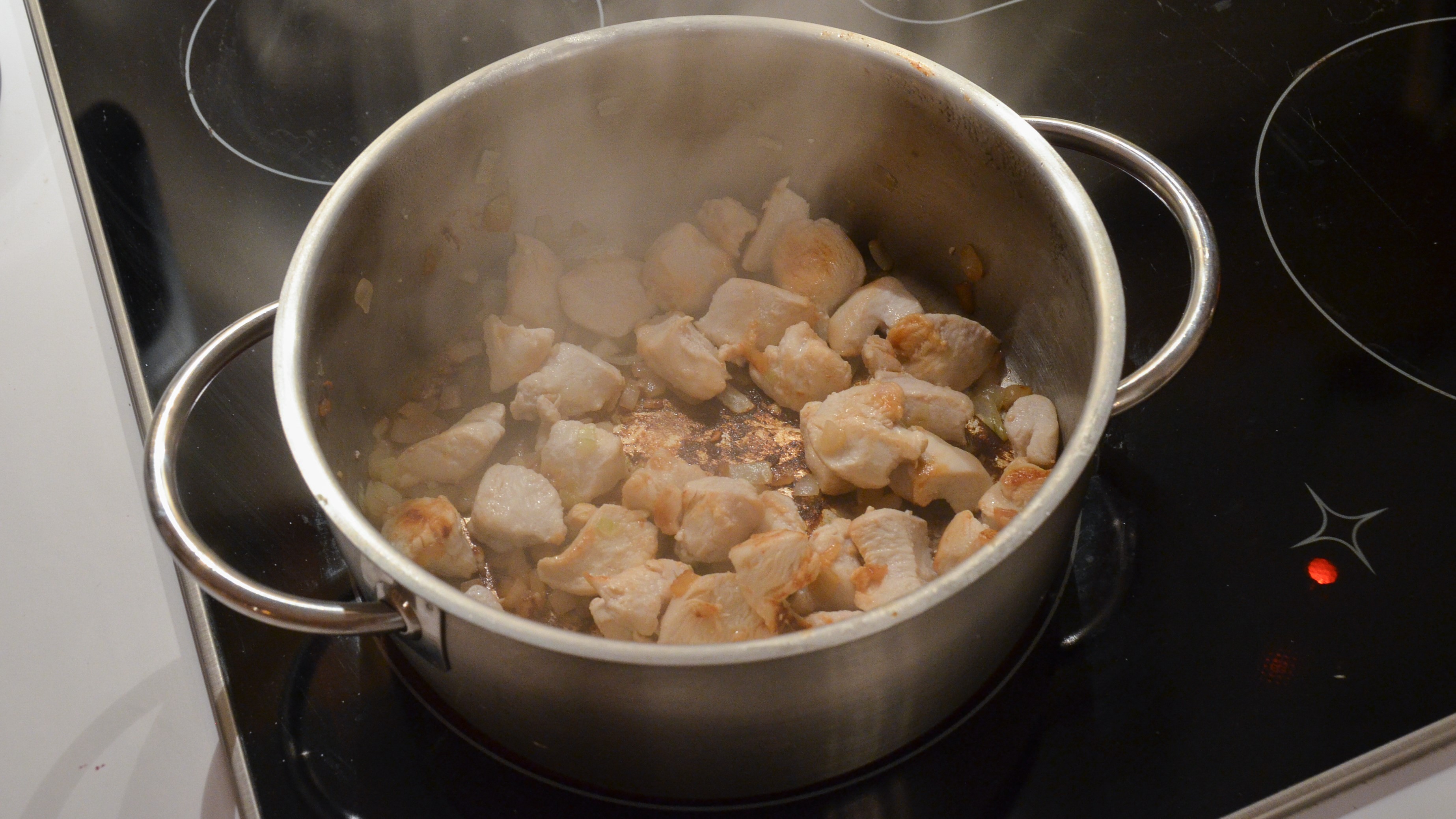 Zwiebel würfeln und im Topf glasig dünsten. Fleisch mit der Schere in maximal dominosteingröße Stücke schneiden, mit Pfeffer würzen und ebenfalls in den Topf geben. Scharf anbraten, dann mit etwa einem Pinnchen Sojasoße ablöschen.