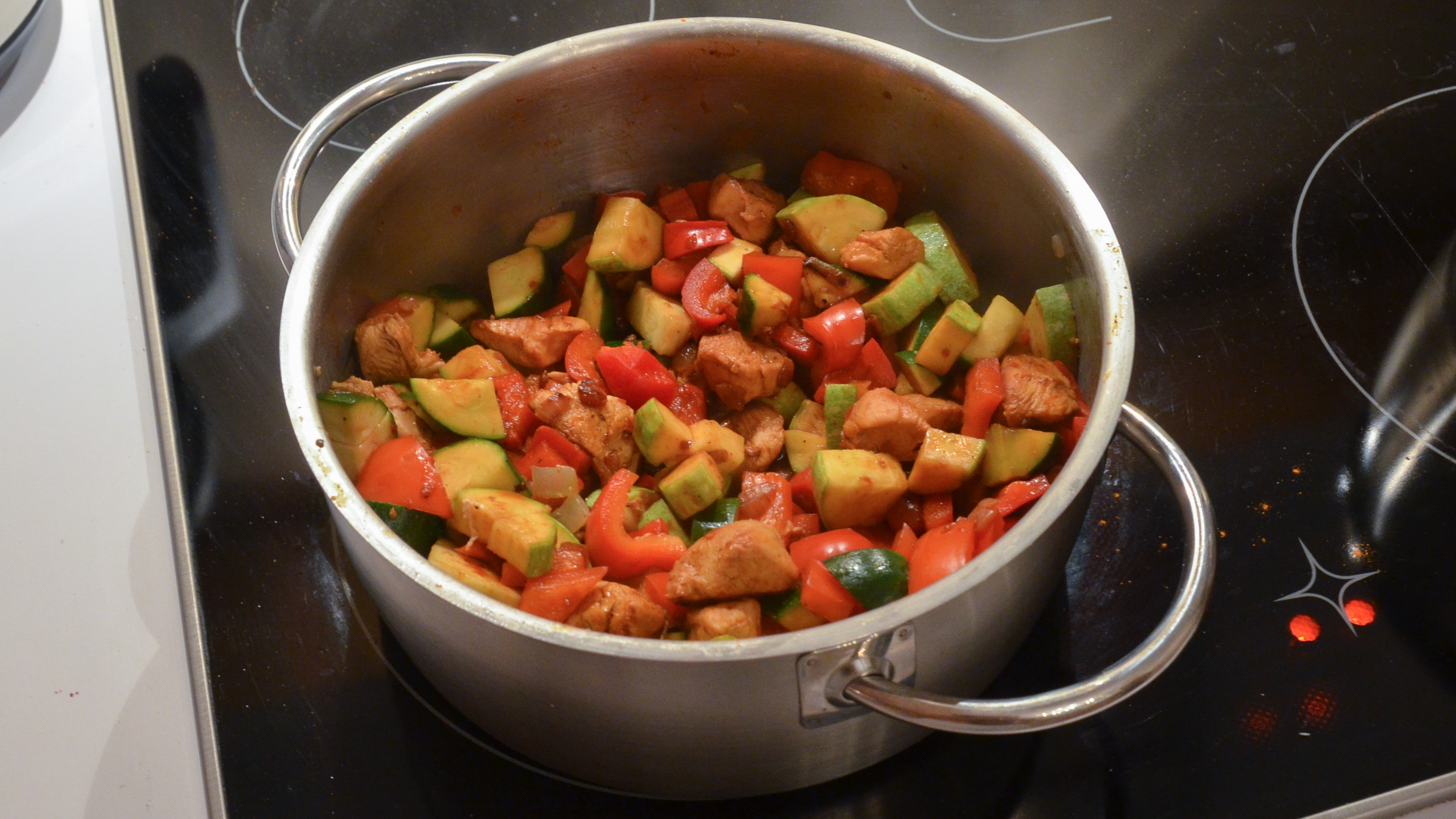 Einige Minuten köcheln lassen und ab und zu umrühren. Eventuell etwas Wasser hinzugeben (darf nie ganz trocken werden, sonst brennt es an).