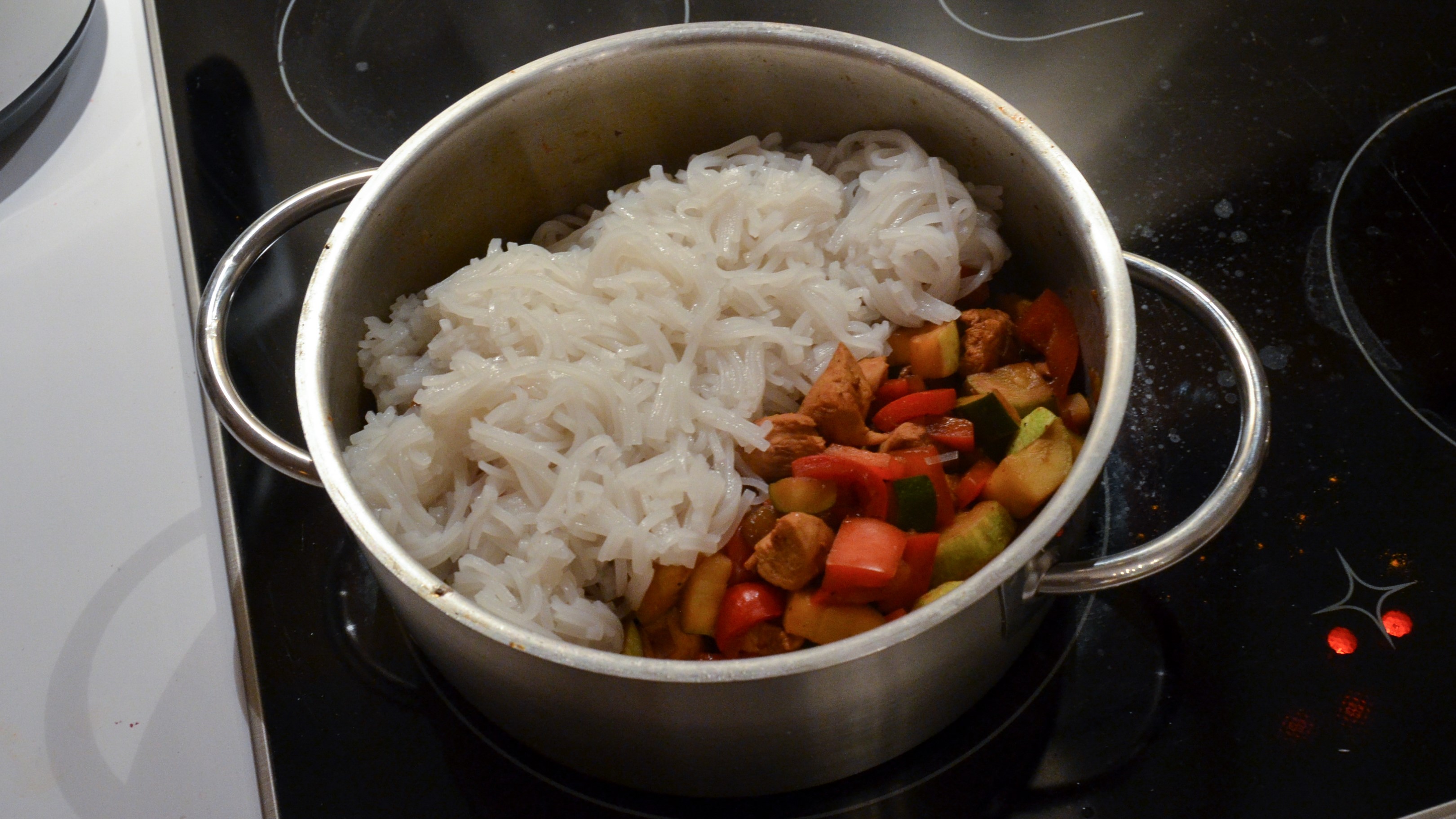 Währrenddessen Glasnudeln nach Anweisung in Salzwasser zubereiten (2—3 Minuten). Nudeln abgießen und mit der Schere im Topf in ca. 1 bis 2 cm lange Stücke schneiden. Dann mit in den Gemüsetopf werfen und zum Abschluss noch einmal aufkochen.