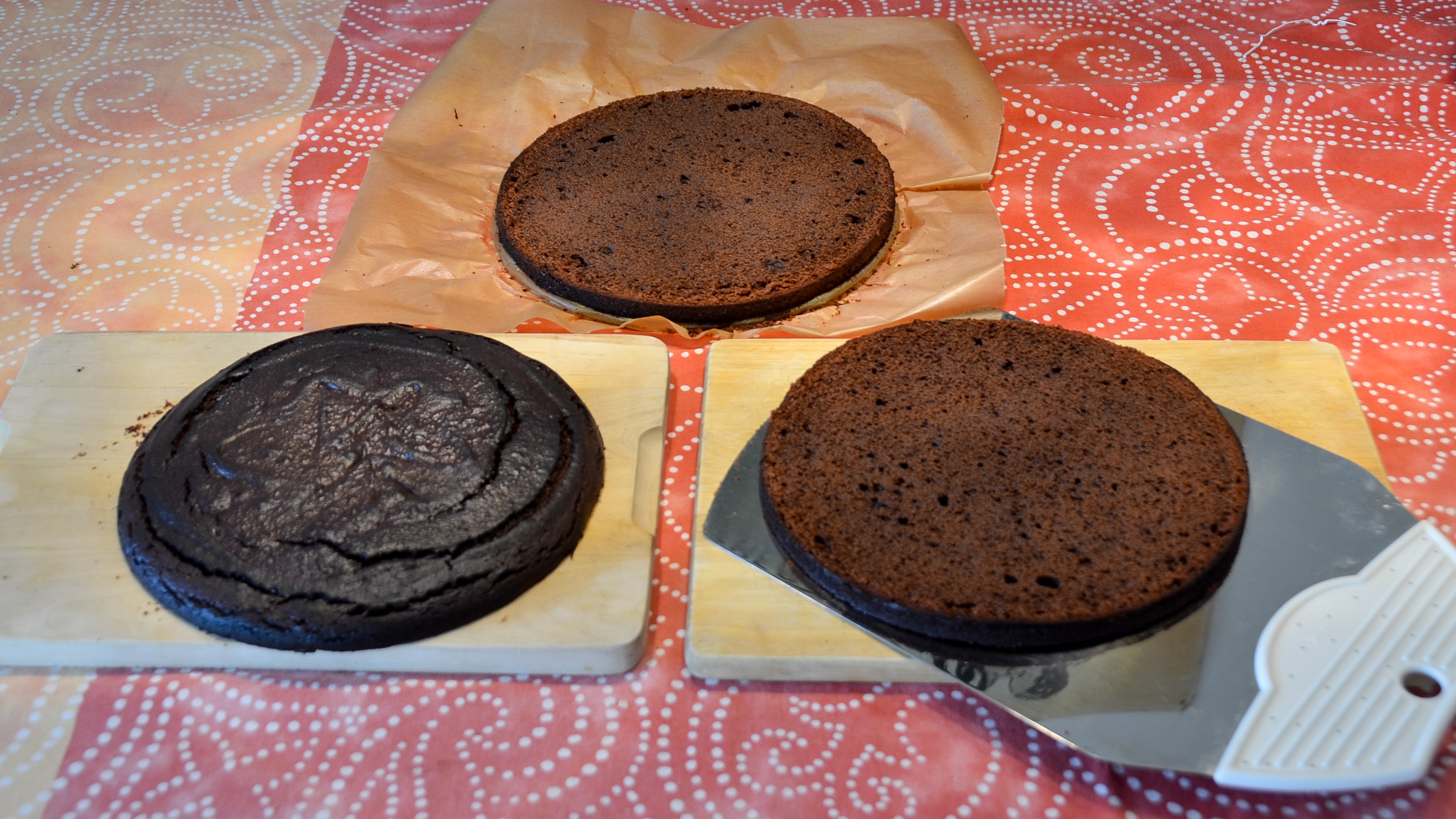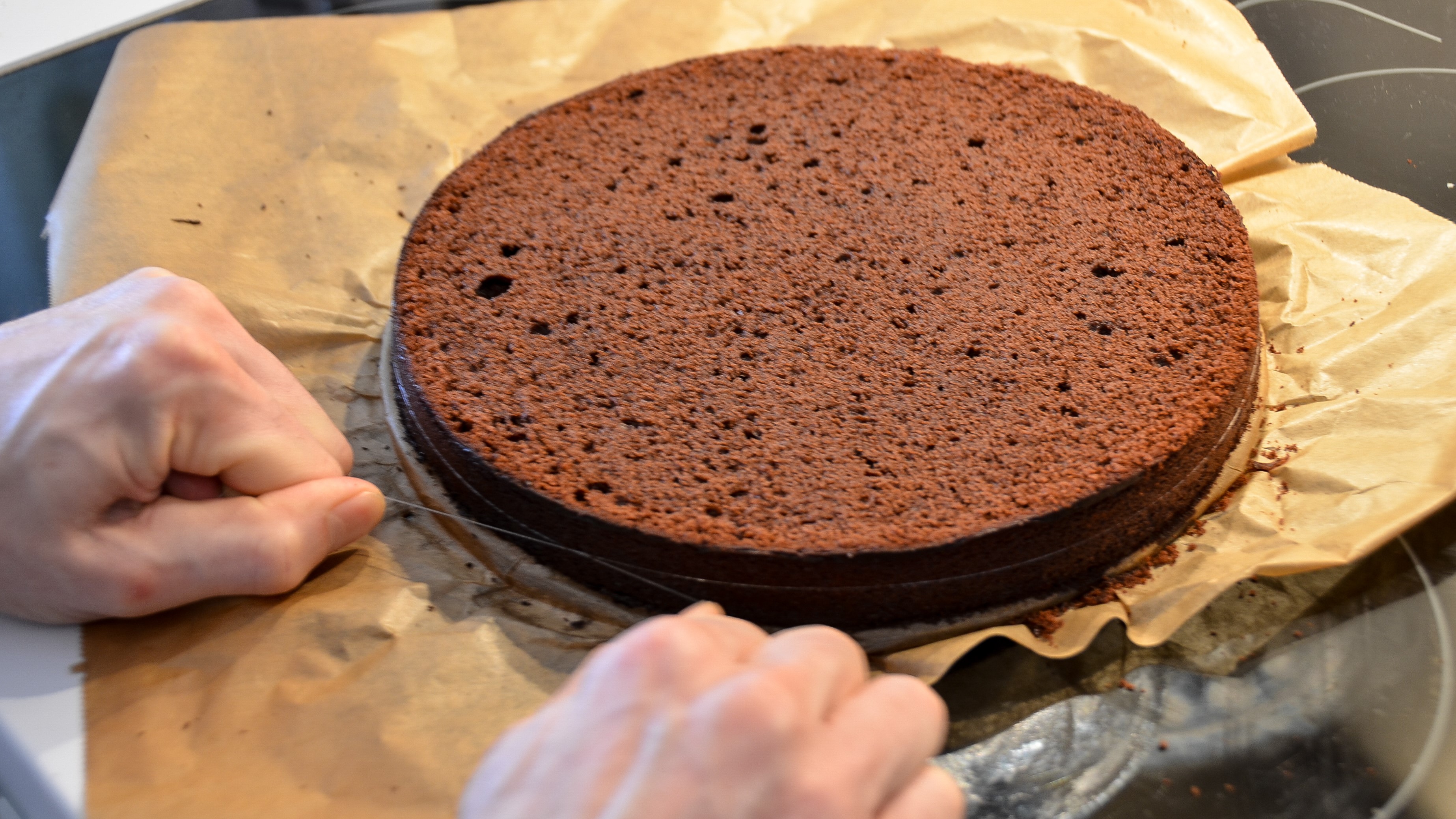 Zum Teilen des Kuchens in drei Böden entweder Faden um den Kuchen legen und hindurchziehen oder Kuchen-Schneide-Blech hindurchdrücken.