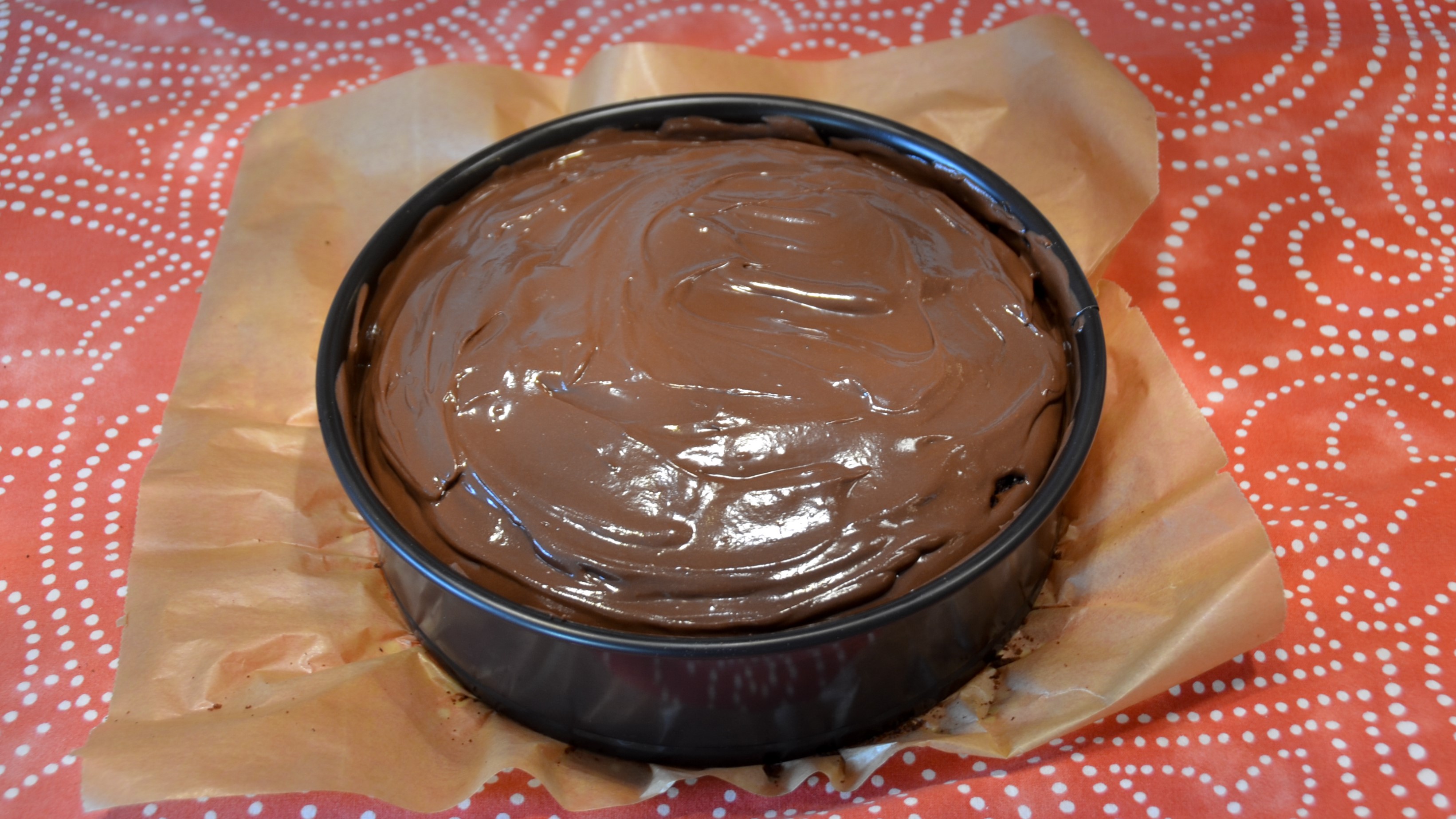 Ofen auf 180 °C vorheizen, Springform mit Backpapier auslegen, evtl. mit Kakaopulver ausstreuen.