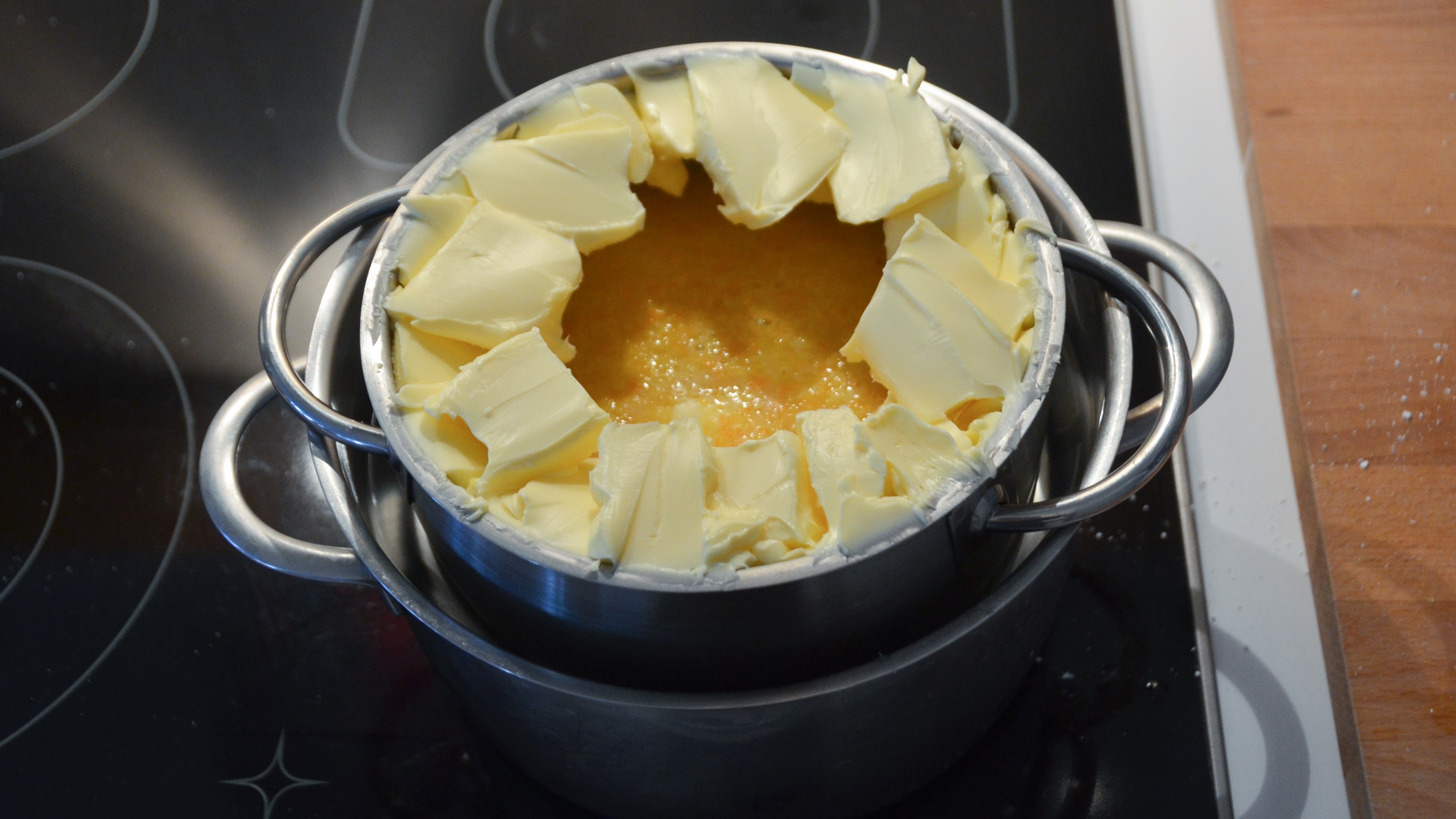 Das Wasserbad sollte nicht sprudelnd kochen, damit kein Wasser in die Zitrus-Creme spritzt.