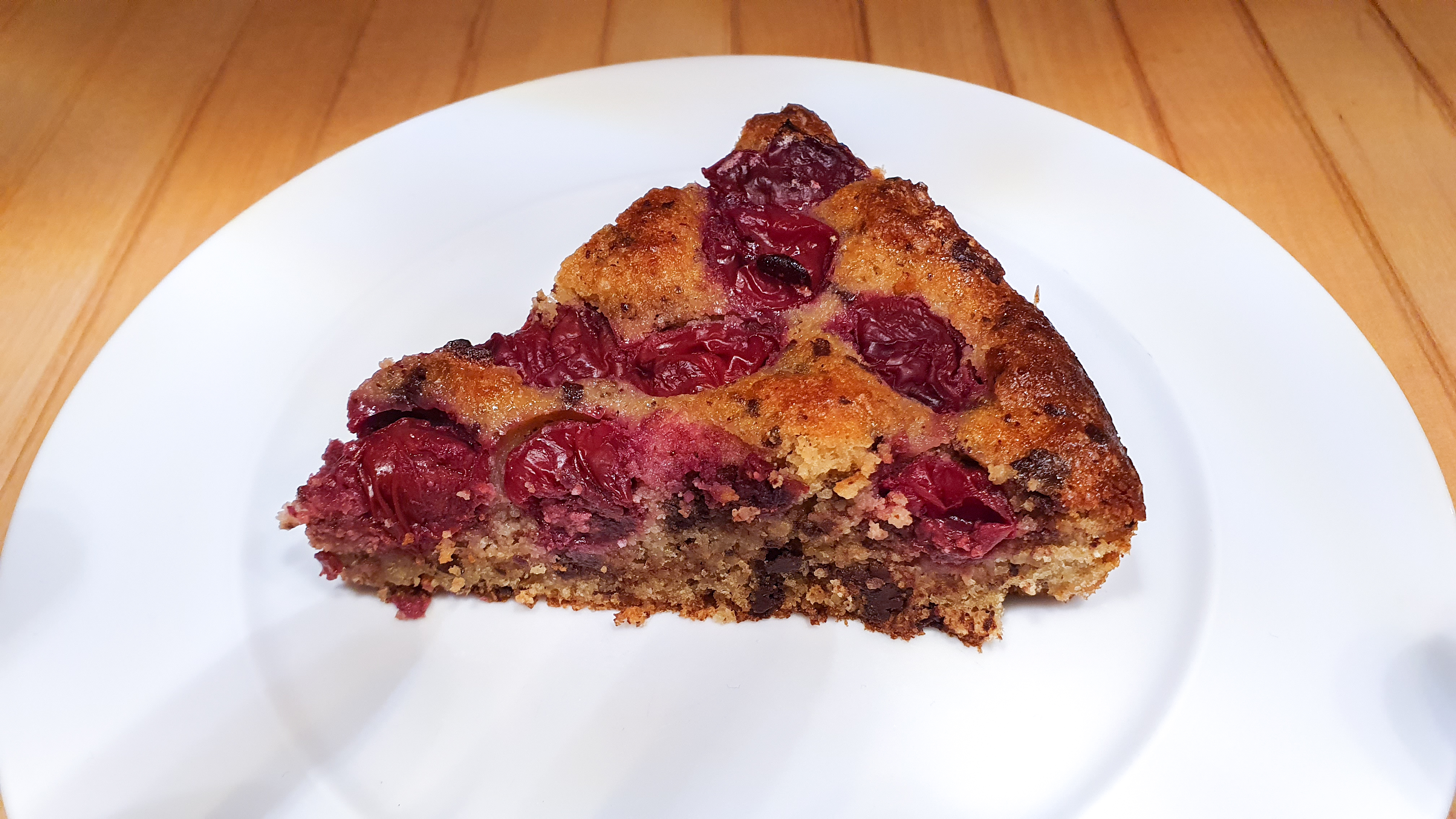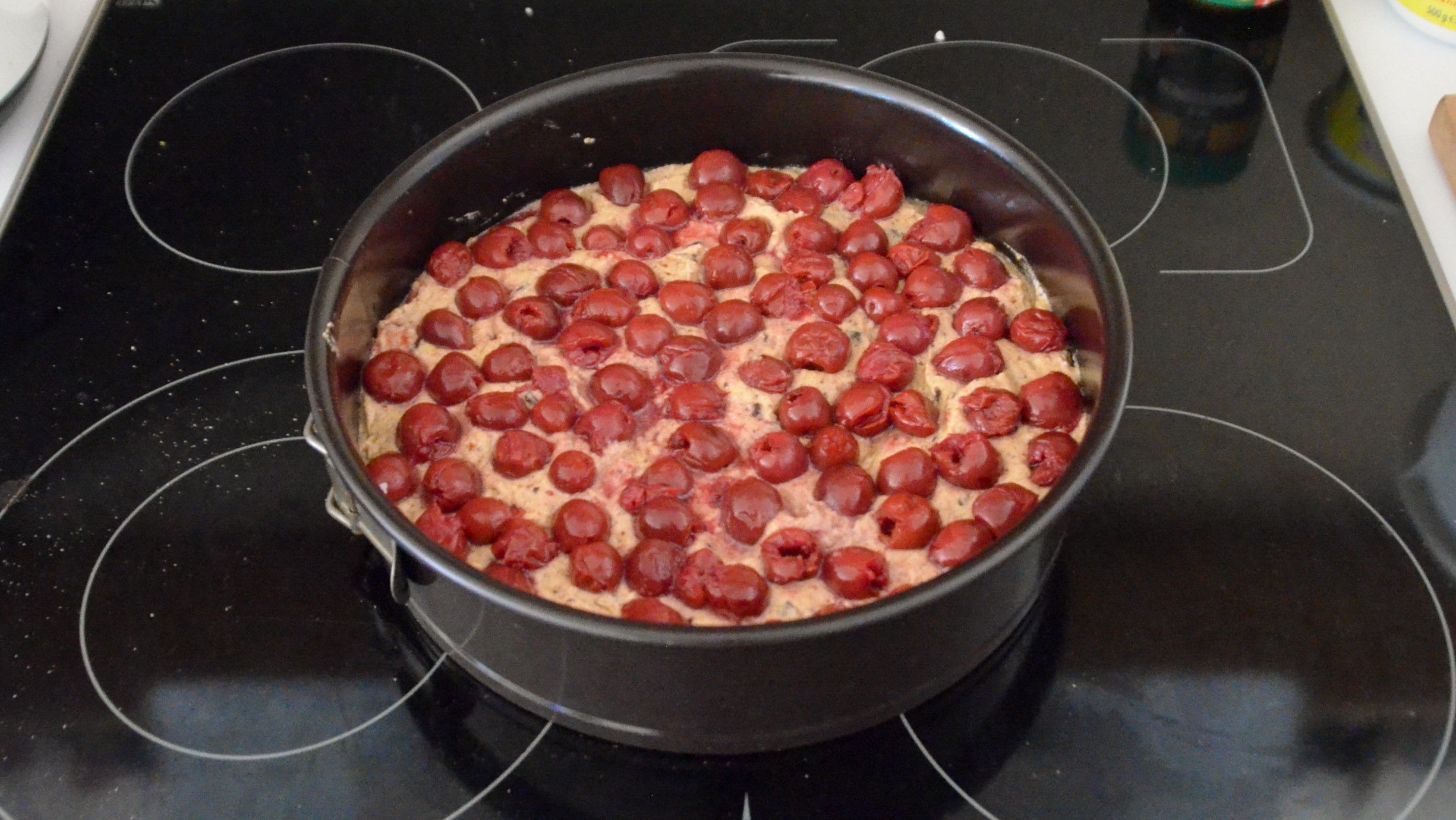 Kuchenform fetten oder mit Backpapier auslegen und Kuchenteig einfüllen. Kirschen gleichmäßig darauf vereilten, evtl. etwas in den Teig drücken. Bei 180 °C backen bis der Kuchen von oben deutlich dunkler, innen aber noch leicht klietschig ist (etwa 30 Min.).