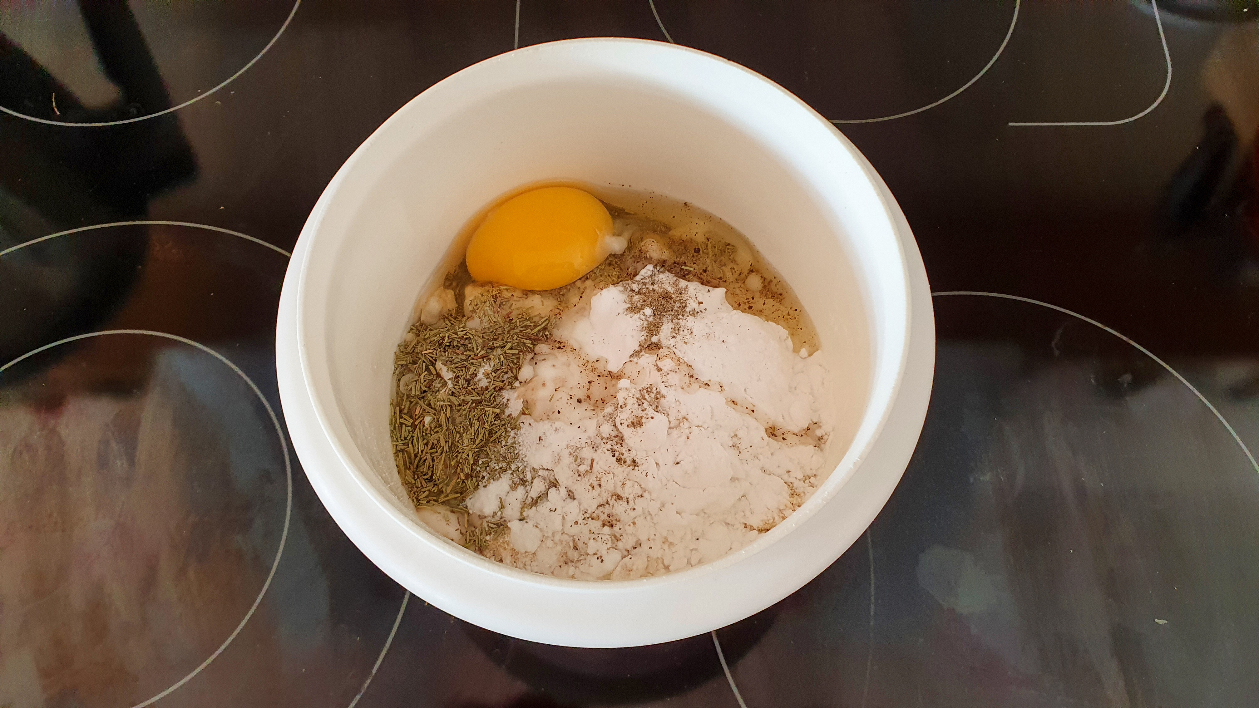 Gemahlene Mandeln, Kartoffelstärke und Mehl miteinander vermengen. Ein Ei, Olivenöl, Wasser und die Gewürze hinzugeben. Alles vermixen bis ein gleichmäßiger Teig entsteht. Gegebenenfalls noch etwas Kartoffelstärke hinzufügen, falls der Teig zu klebrig ist, um ihn mit dem Nudelholz zu bearbeiten. Den fertigen Teig für 10 Min. in den Kühlschrank stellen.