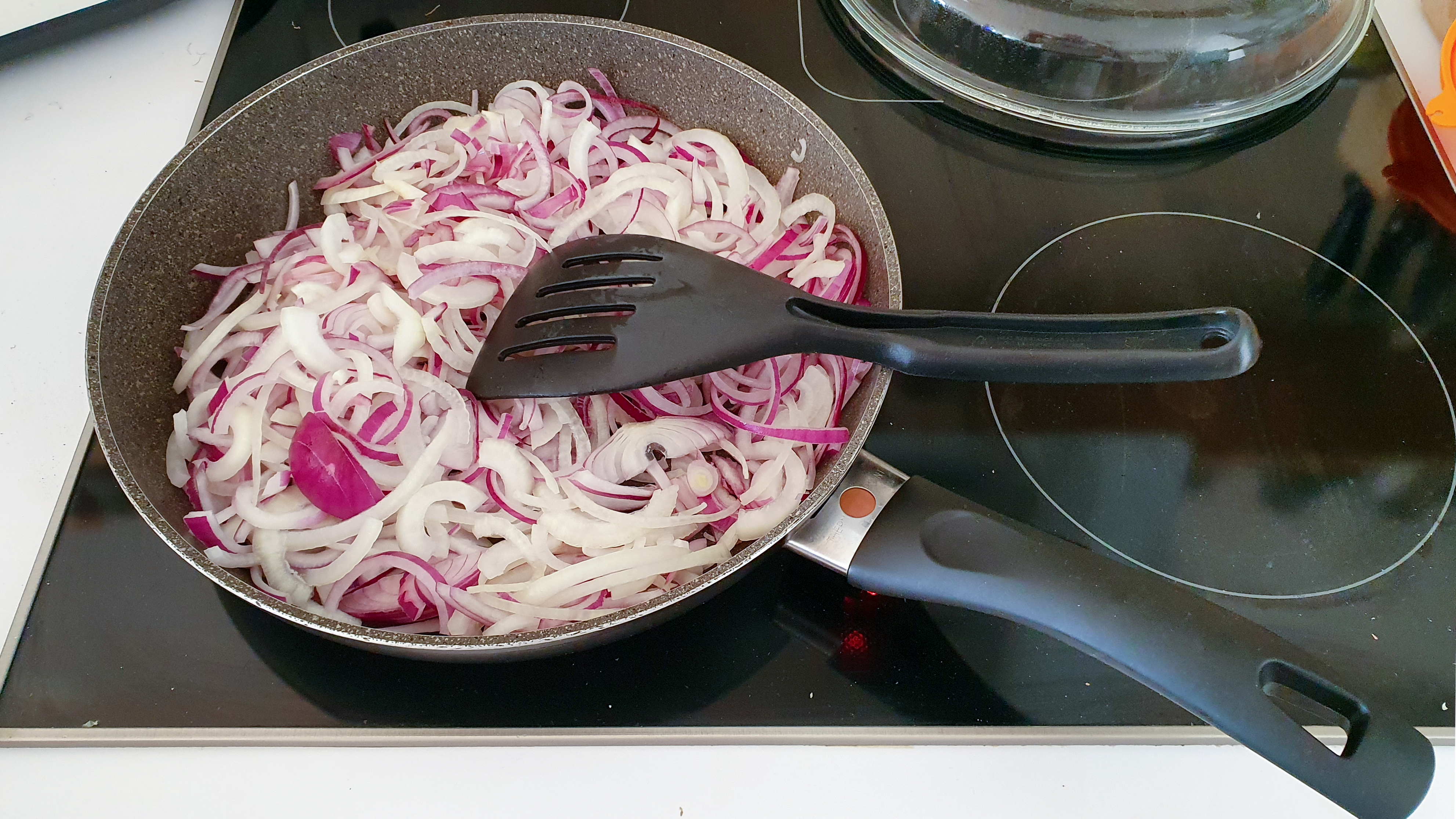 In der Zwischenzeit die Füllung zubereiten: Zwiebeln halbieren und in dünne Streifen schneiden. Knoblauchzehen klein hacken.