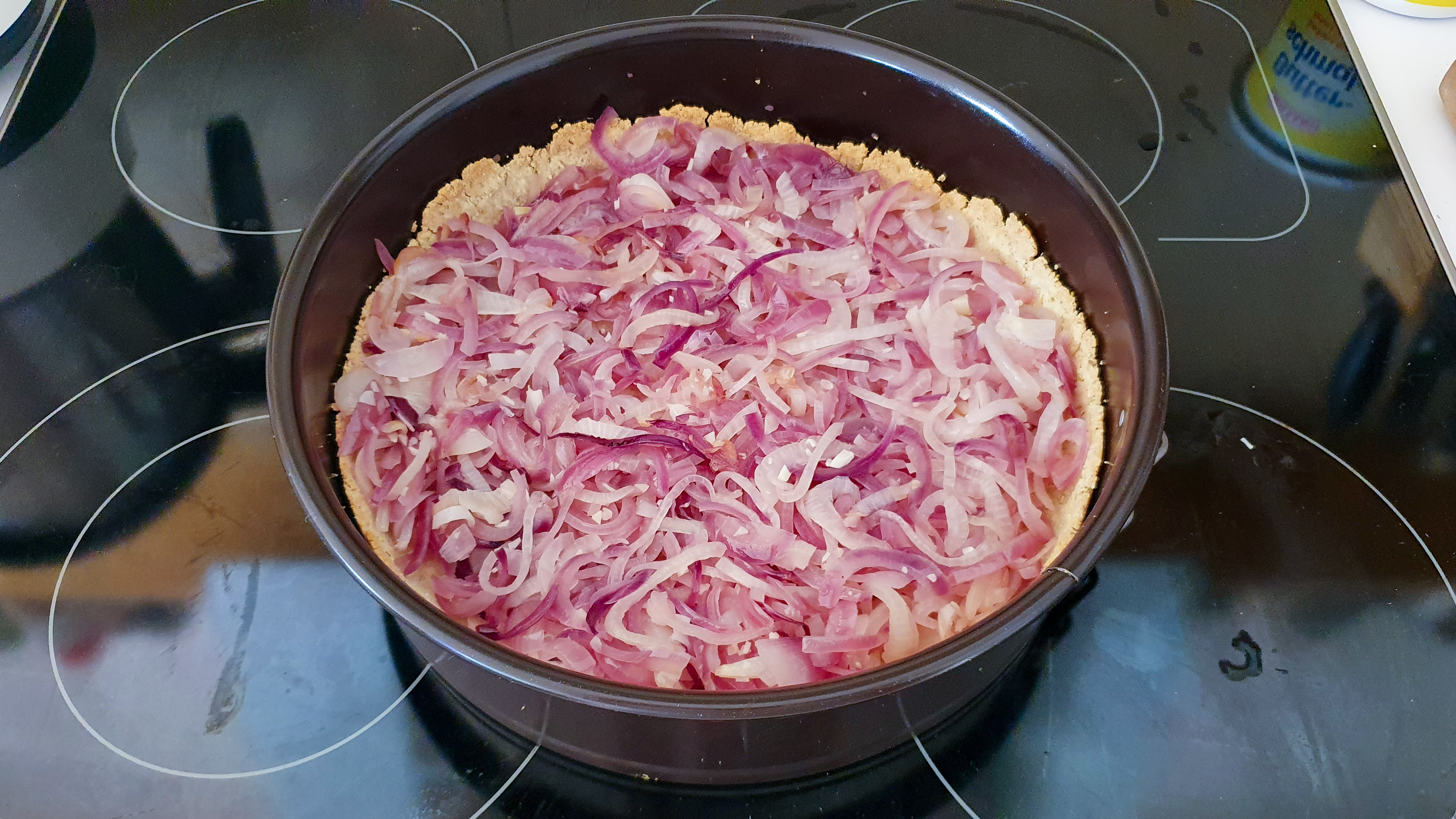 Kokosmilch mit den drei Eiern und den Gewürzen vermengen. Zwiebeln dazugeben. Die Masse auf den Kuchenboden gießen und für weitere 30 Min. in den Ofen geben. Der Zwiebelkuchen ist fertig, wenn die Zwiebeln etwas Farbe angenommen haben.