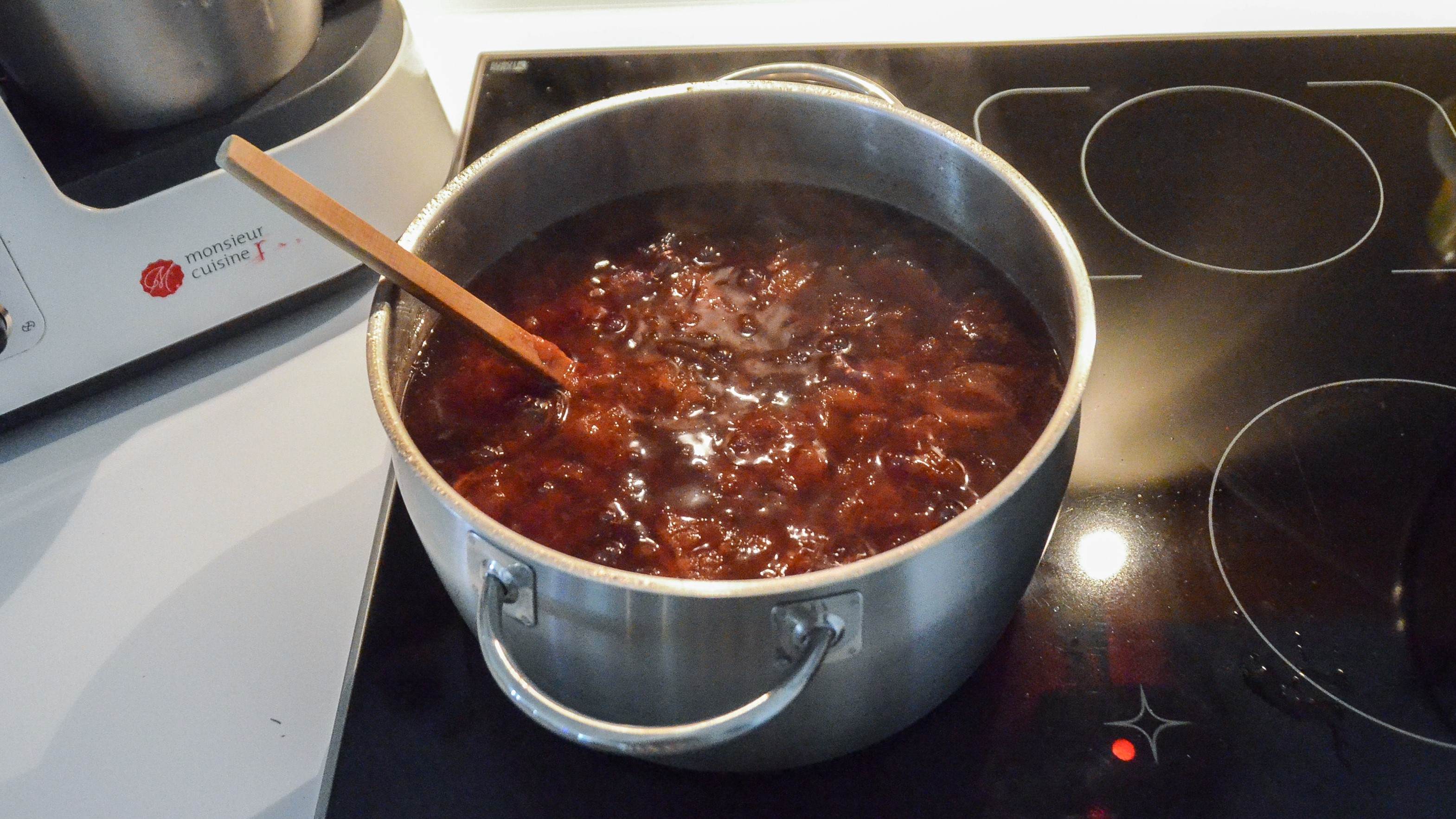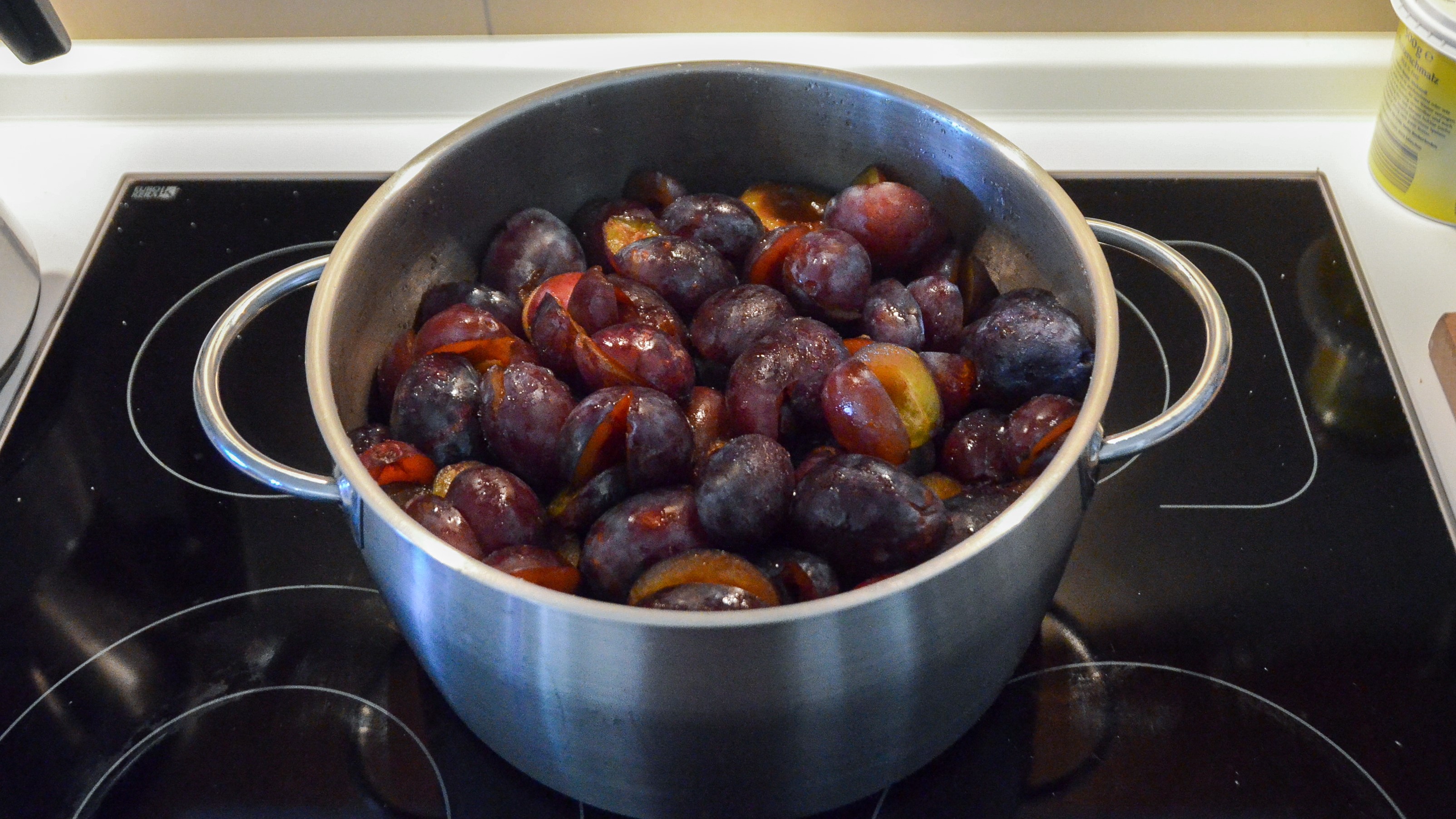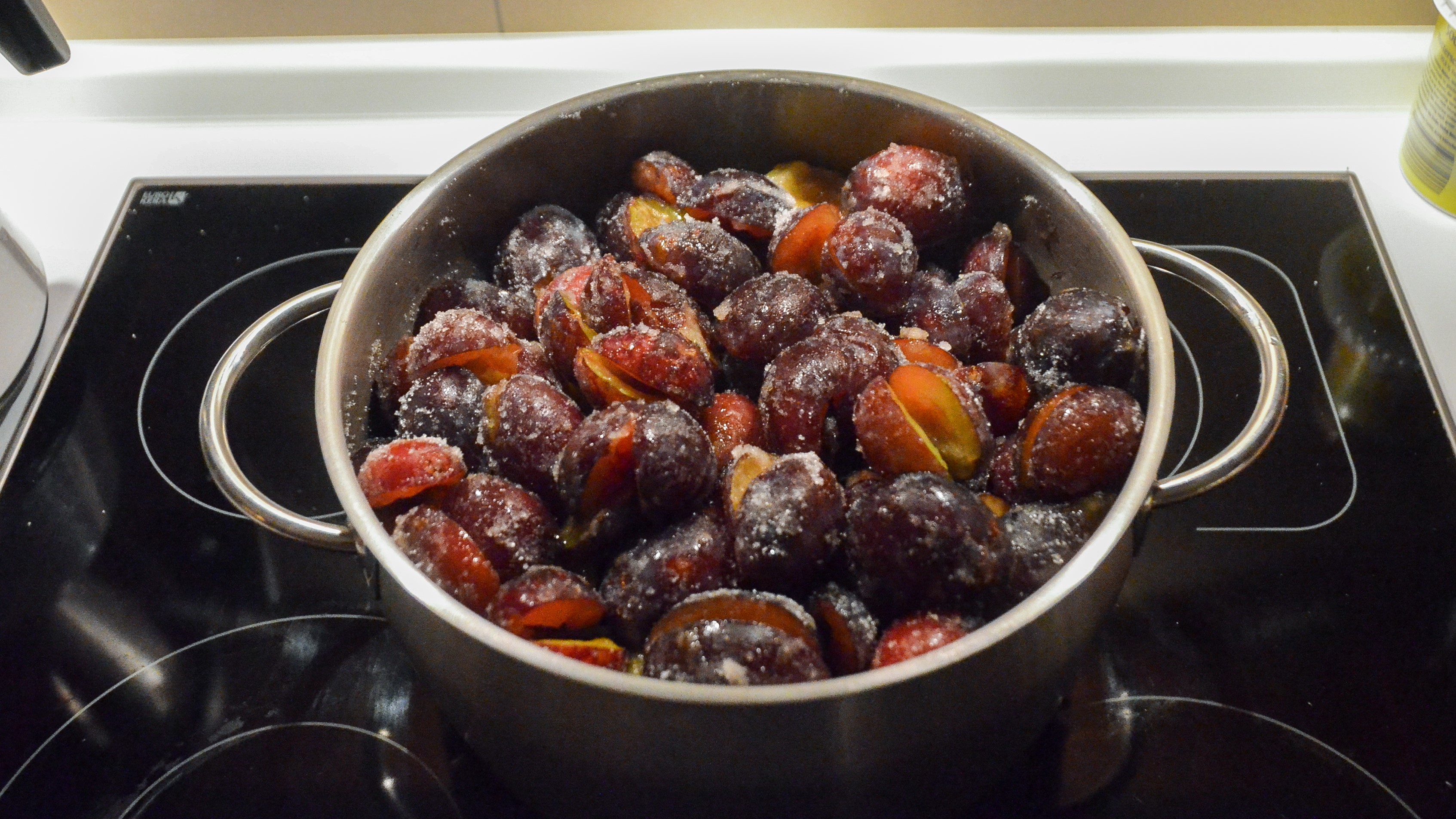 Pflaumen waschen, halbieren und entsteinen. Entsteinte Pflaumen und Zucker in einen Topf geben und einmal umrühren. Dann Deckel auf den Topf und wenigstens 6 Stunden durchziehen lassen. Ab jetzt ist die oberste Prämisse: Nicht rühren! Auch wenn's schwer fällt.