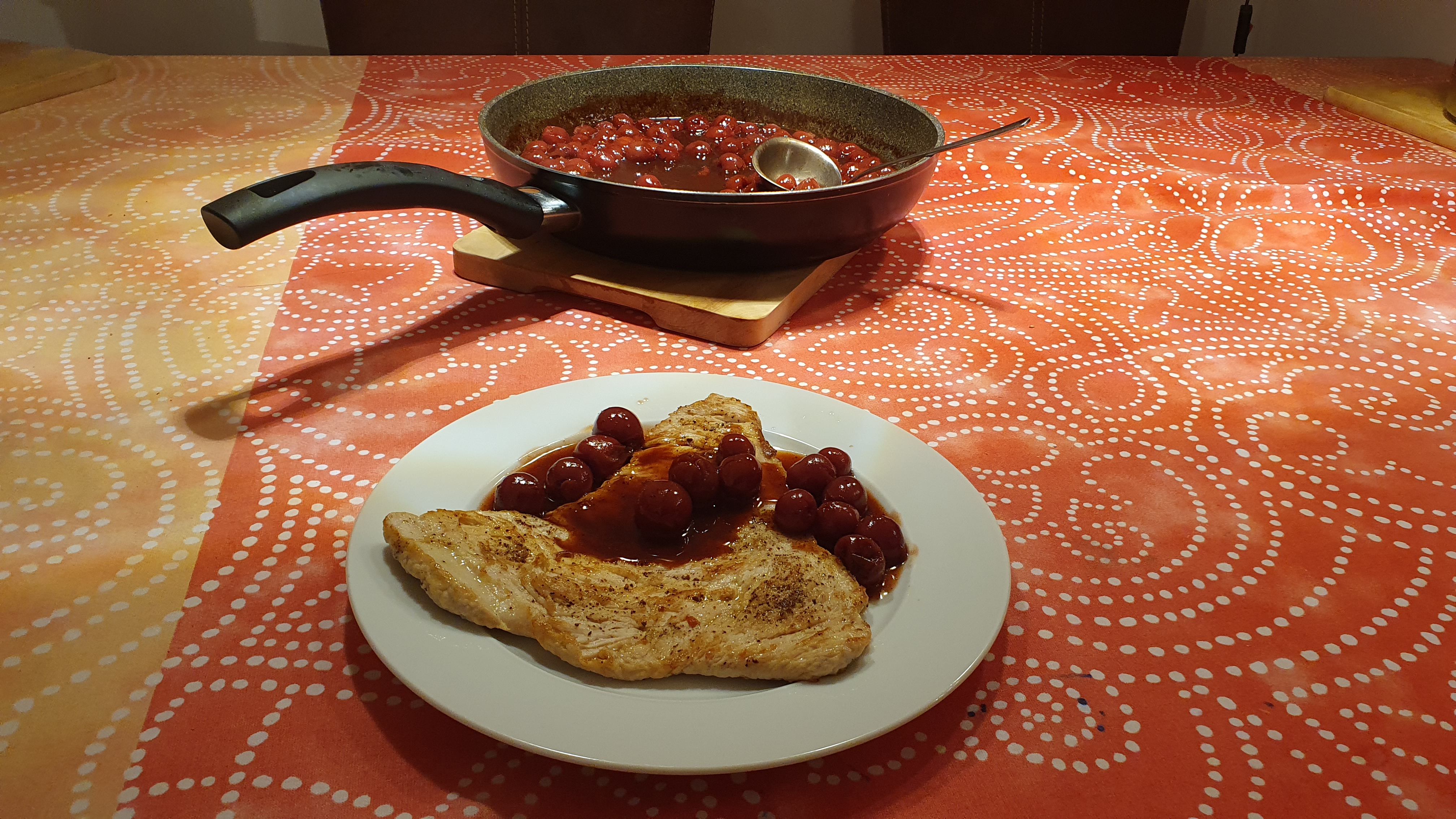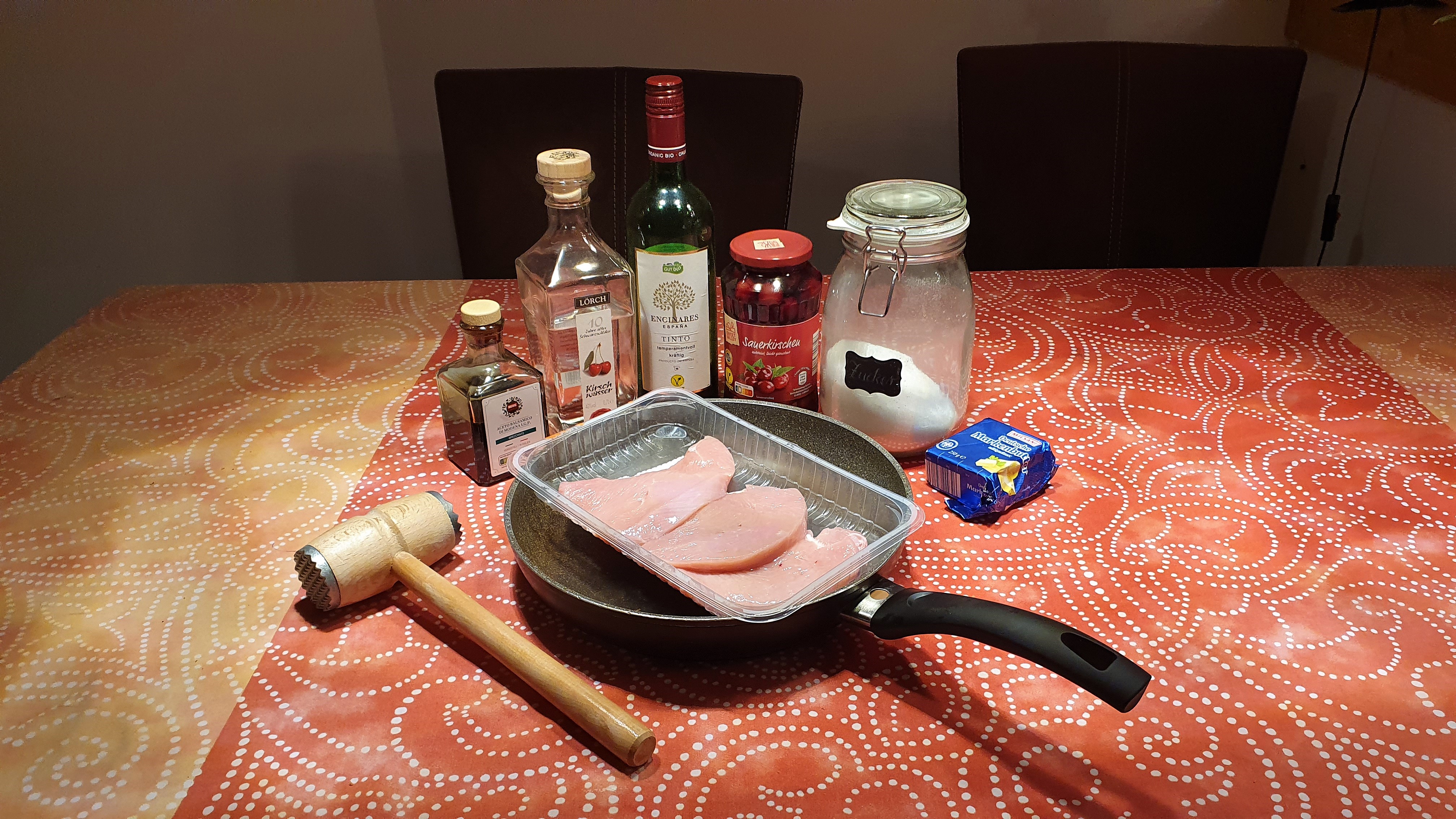 Den Essig zum Bratfond geben, den Zucker unterrühren, dann Wein und Kirschwasser hinzufügen und kurz ein paar Minuten köcheln lassen. Aufgefangenen Kirschsaft hinzufügen. Das Ganze mit der kalten Butter abbinden und mit Pfeffer und Salz abschmecken.