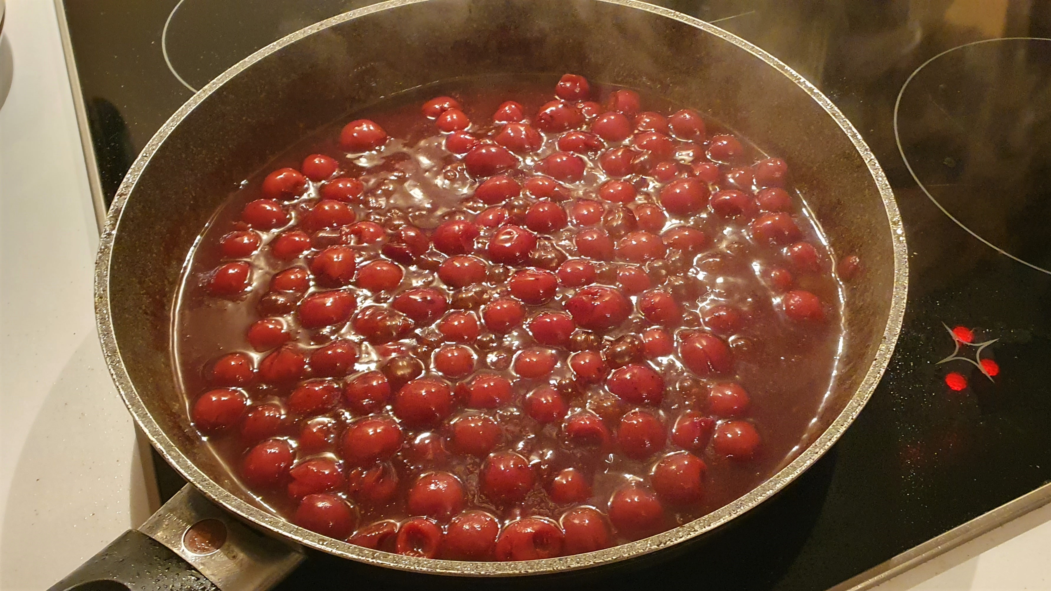 Kirschen hinzufügen und kurz mit warm werden lassen.