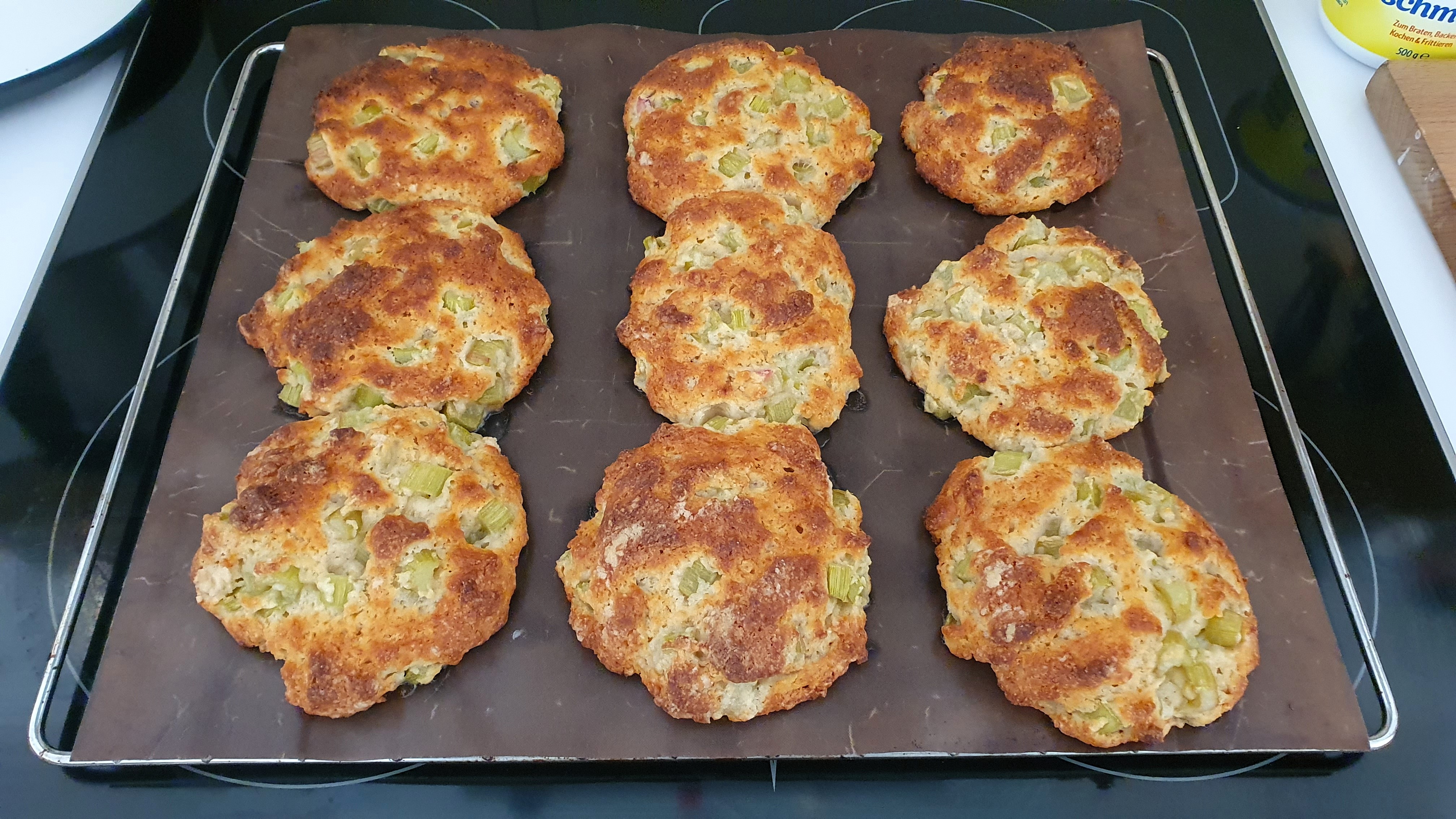 Wenn es gerade keinen frischen Rhabarber gibt, dann kann man auch die gleiche Menge eingekochten Rhabarber verwenden. Die Konsistenz des Teigs verändert sich dadurch. Die Backzeit verlängert sich um ein paar Minuten und es werden Rhabarber-Taler statt Rhabarber-Ballen. Das hat den Vorteil, dass sie sich gut im Toaster aufbacken lassen.