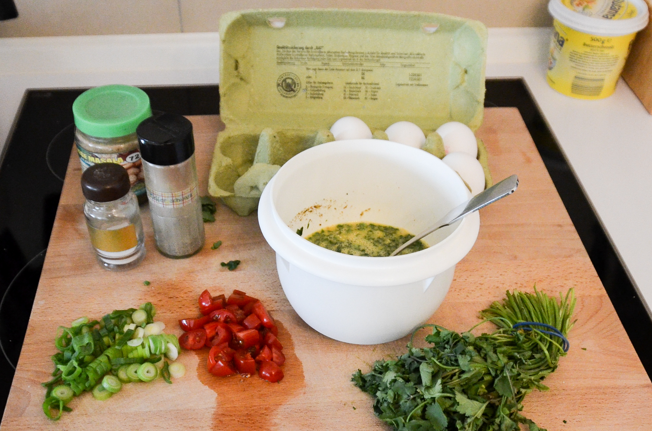 Eier in eine kleine Schüssel schlagen, mit Salz, Pfeffer, Currypulver und einem Schluck Milch mischen. Alles gut verrühren, bis sich die Gewürze gleichmäßig verteilt haben.