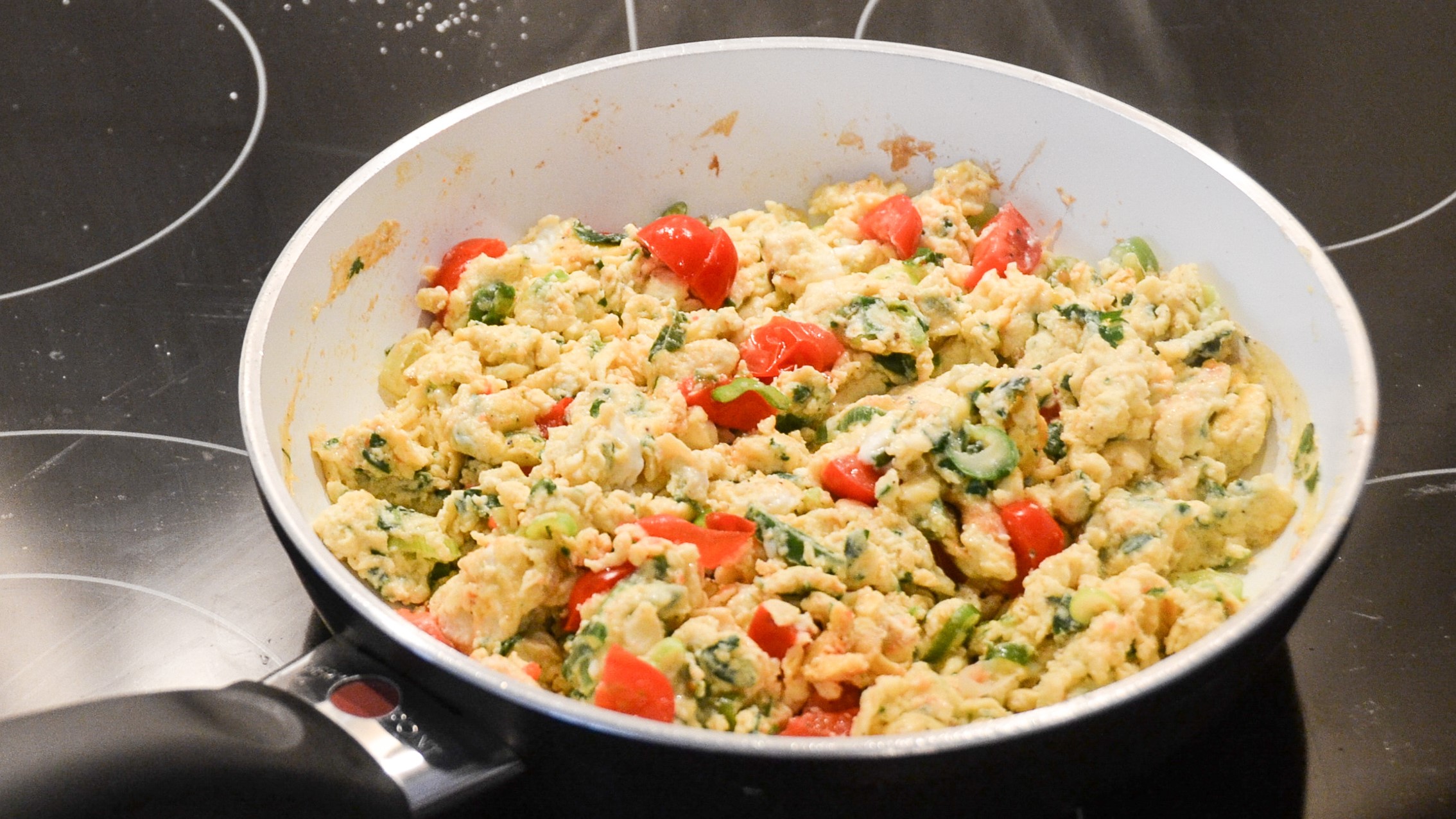 Etwas Fett in der Pfanne erhitzen, die Frühlingszwiebel andünsten, die Eimasse hinzugeben und den Käse gut verteilen. Sobald das Ei anfängt an den Rändern zu stocken mit einem Pfannenwender durch das Ei schieben. Vorgang wiederholen bis das ganze Ei nahezu fest ist. Das Rührei auf eine Seite der Pfanne schieben, in den frei gewordenen Teil die Tomaten geben und unter wenden leicht anbraten. Dann alles miteinander vermengen. Noch heiß genießen.
