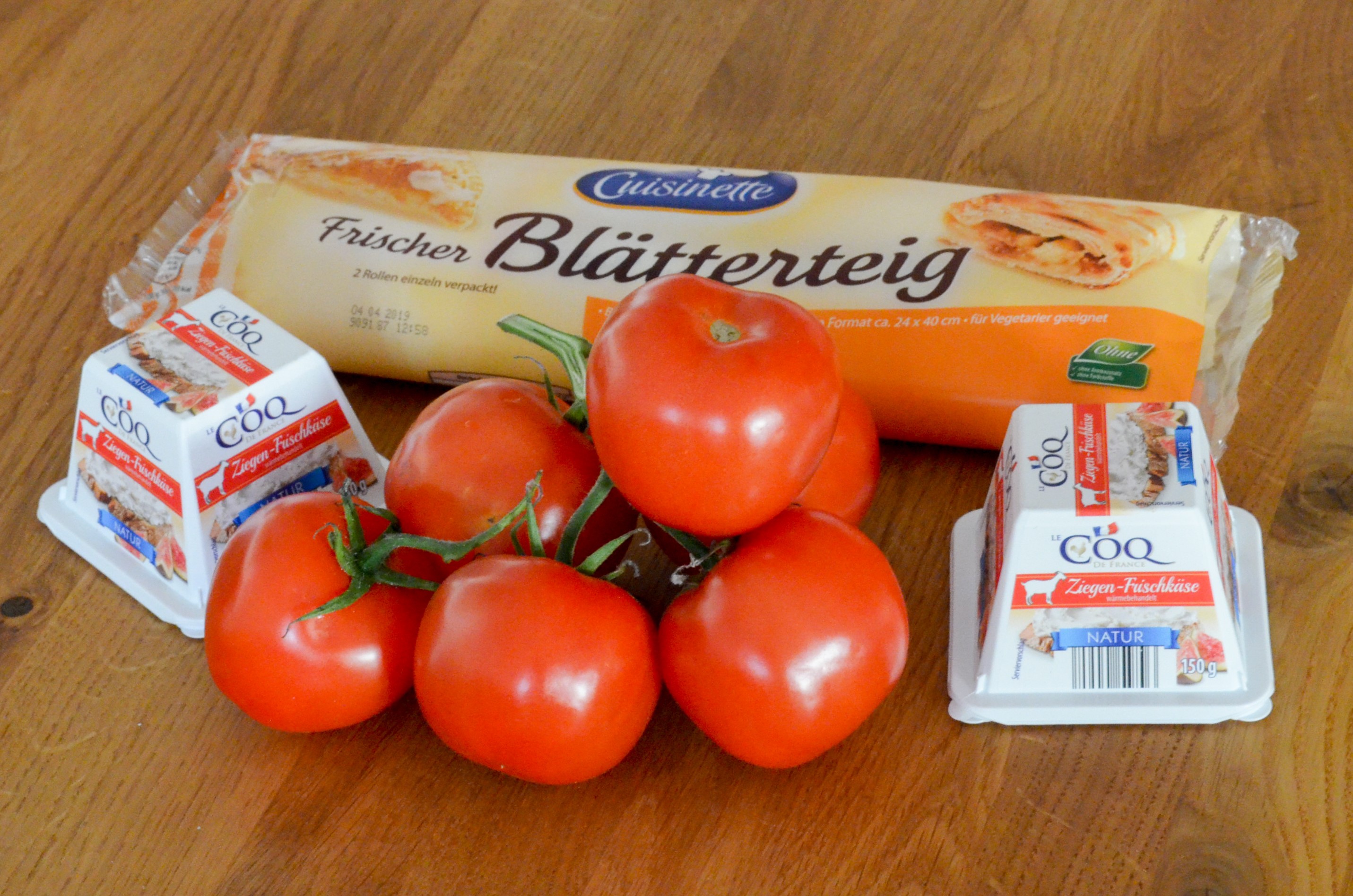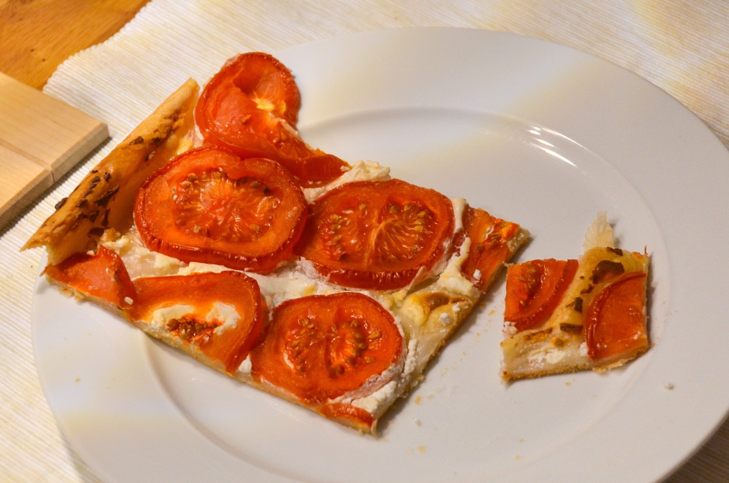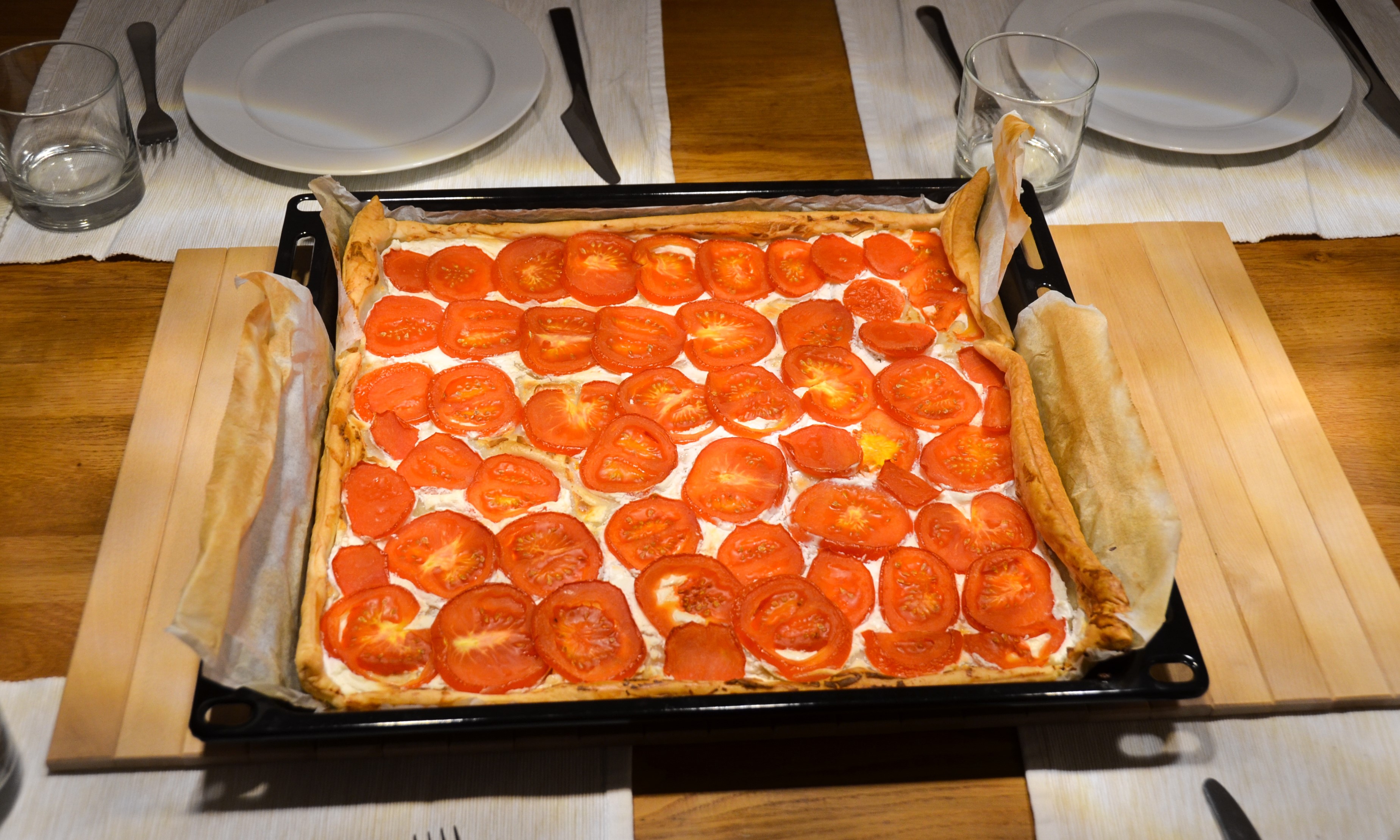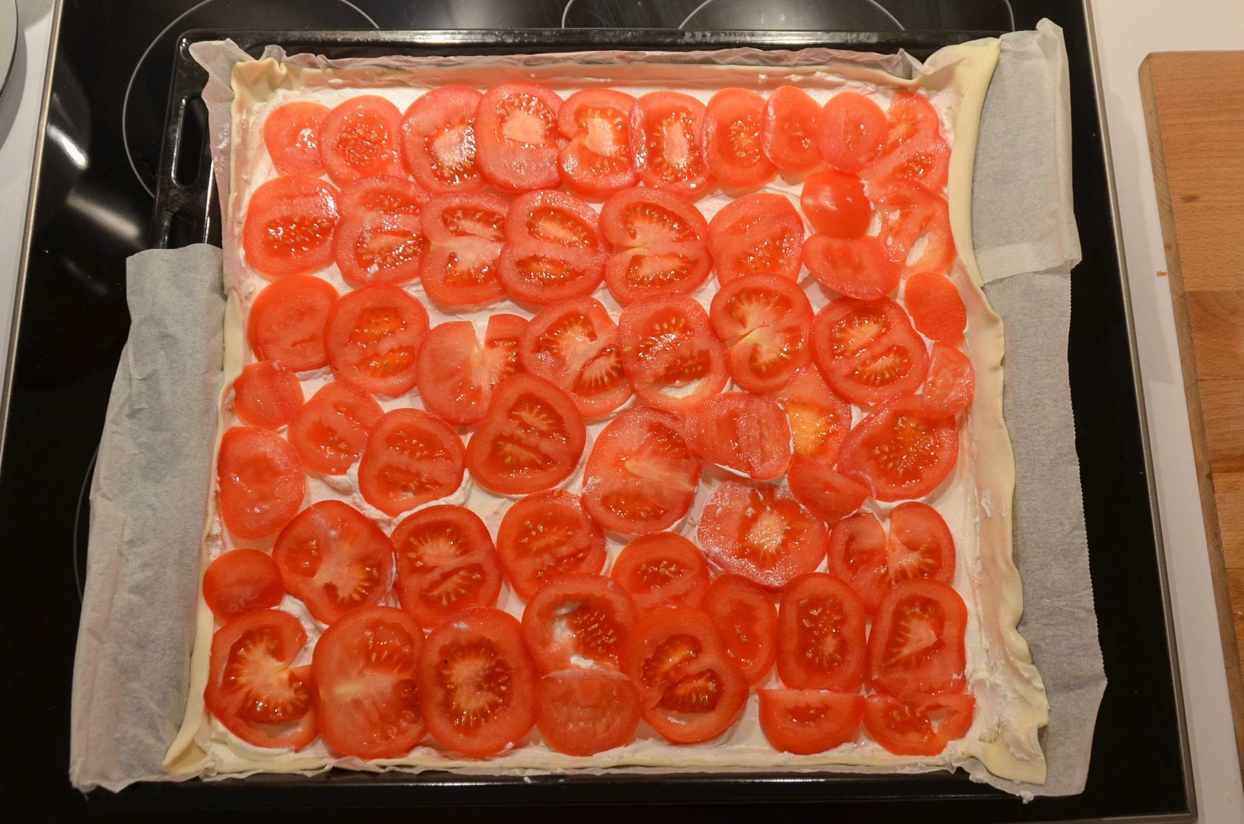 Blätterteig auf dem Backblech ausrollen. Frischkäse nicht zu dick darauf verteilen. Tomaten in nicht zu dünne Scheiben schneiden und überlappend auf dem Teigboden verteilen.